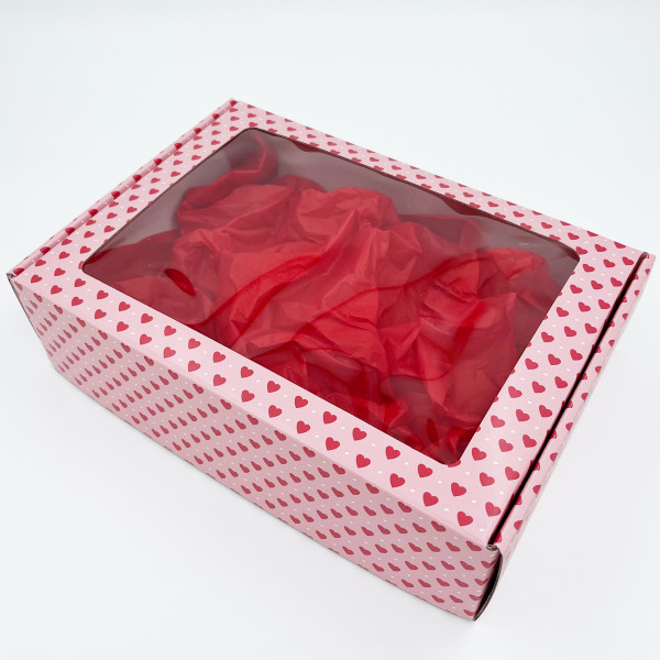 Außerordentlich schöne rosafarbene Schachtel mit rotem Herzmuster und PVC-Fenster.
