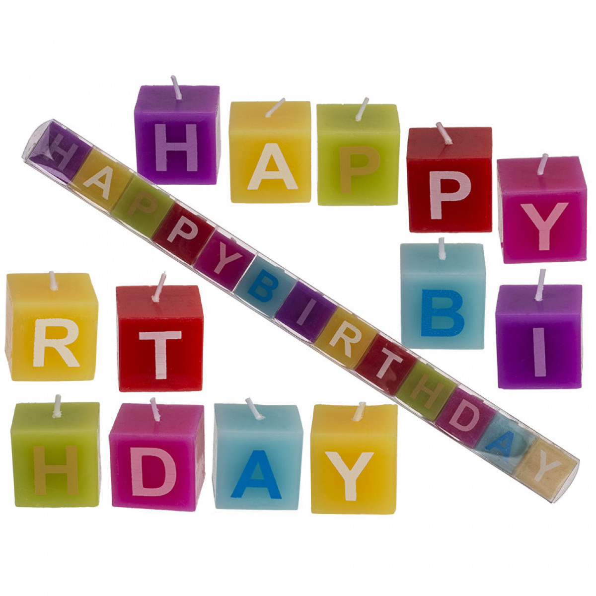 Bunte Geburtstagskerzen - Buchstaben „HAPPY BIRTHDAY“.