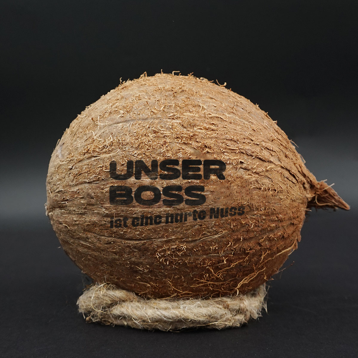 Die gravierte Kokosnuss „Harte Nuss“ ist ein originelles Geschenk, das zum Schmunzeln anregt und gleichzeitig ein exklusives Einrichtungsdetail ist.