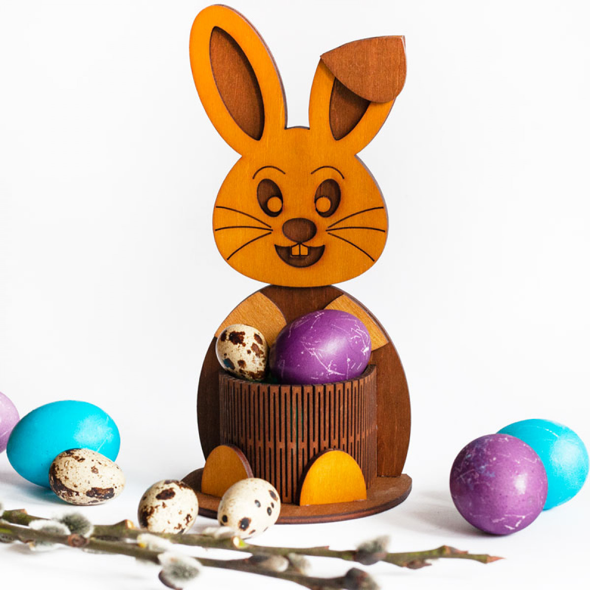 Eierständer aus Holz mit Hasen-Dekoration - eine großartige Dekoration für Ihren Festtagstisch! Dieser Ständer ist wirklich praktisch, denn nach dem Osterfest müssen Sie nicht bis zum nächsten Jahr warten, um ihn wieder zu verwenden. Sie können diesen Ständer bestimmt auch für andere Gegenstände wie Süßigkeiten, Bleistifte und andere kleine Dinge verwenden.