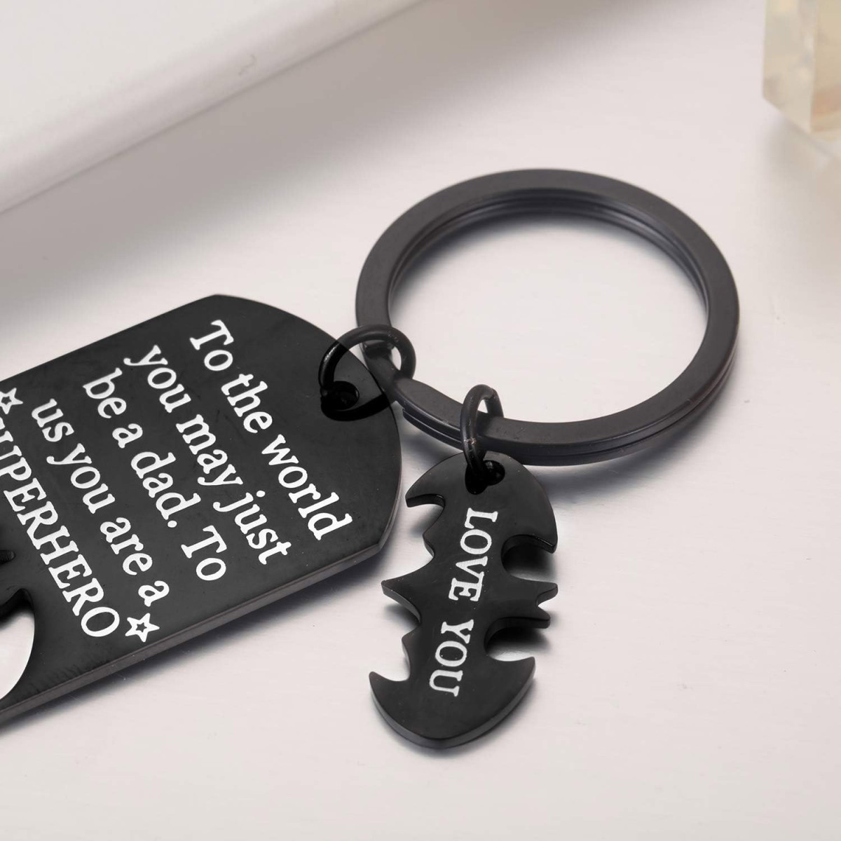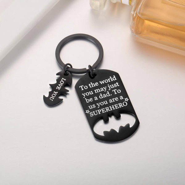 Schwarzer Schlüsselanhänger aus Metall. Der Schlüsselanhänger ist mit der Inschrift „Für die Welt bist Du vielleicht nur ein Vater. Für uns bist Du ein SUPERHERO. LOVE YOU“.