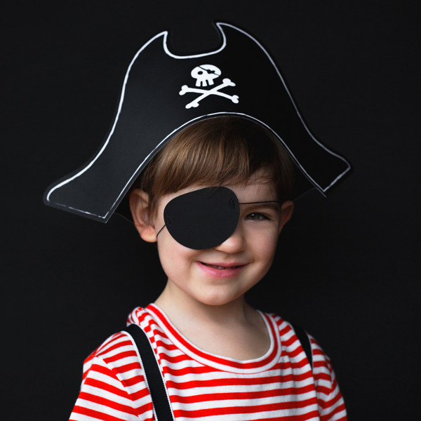 Schwarzer Piratenhut aus Papier mit Augenklappe.